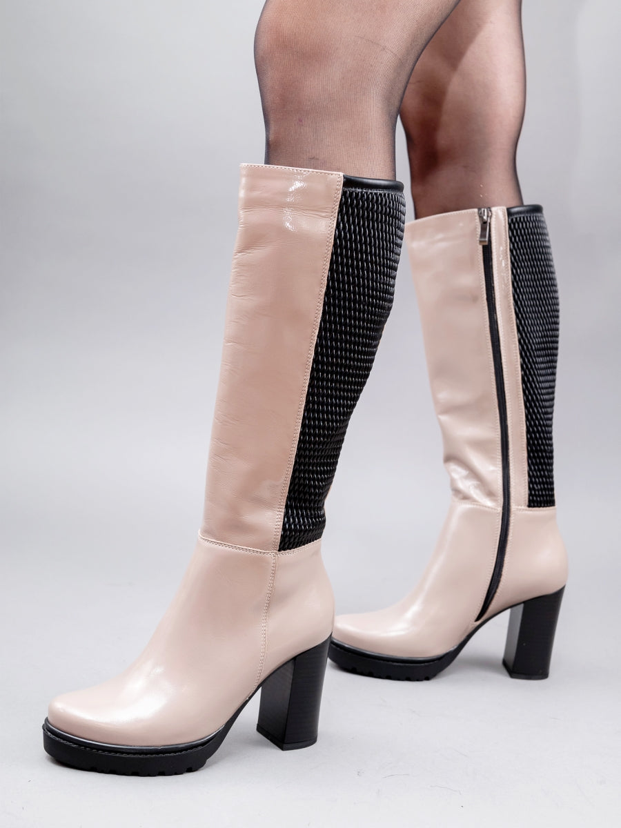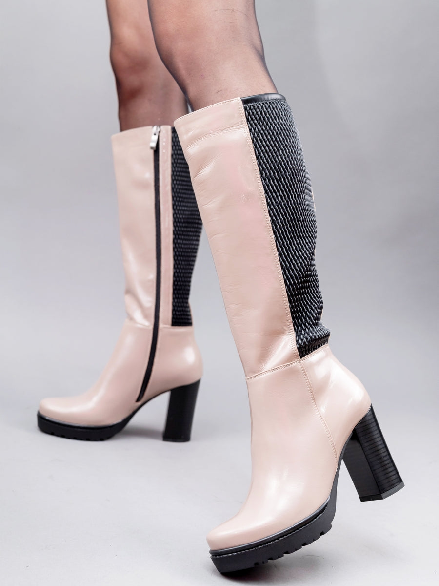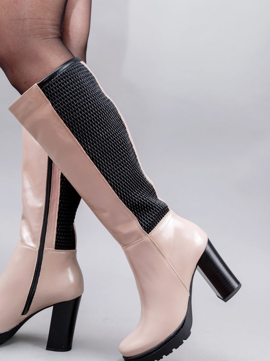 Cizme din piele naturala naplac bej cu strech elastic negru pentru o buna mulare a cizmei pe picior si au toc gros de 9 cm.