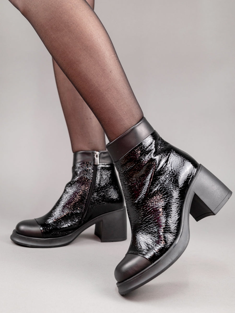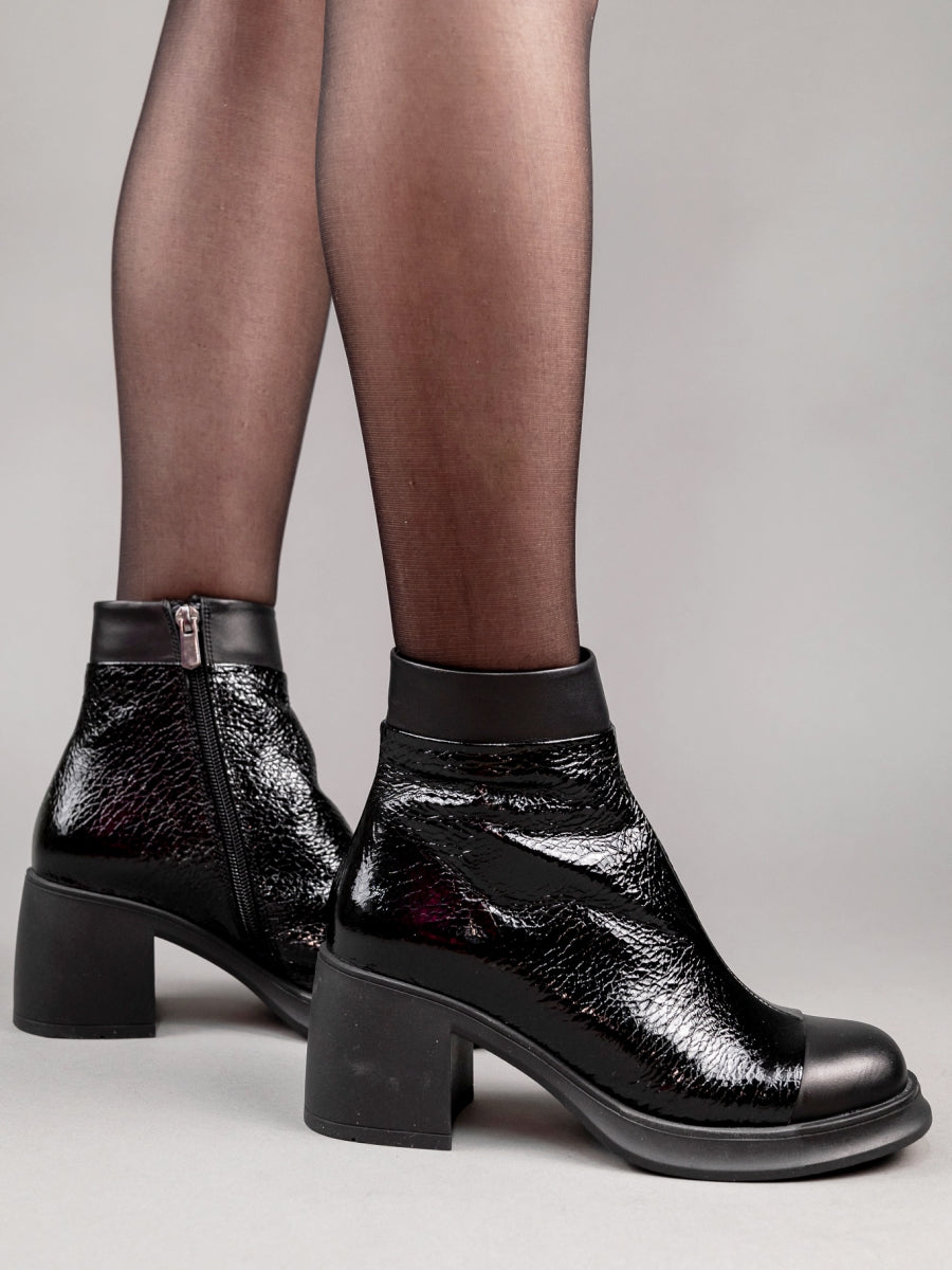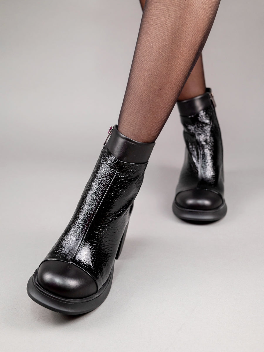 Botine din piele naturala naplac negru combinat cu piele neagra, au fermoar la interior. Talpa este usoara cu toc gros de 7 cm inaltime oferind atat stil cat si confort. Aceste botine sunt perfecte pentru un look elegant si versatil.