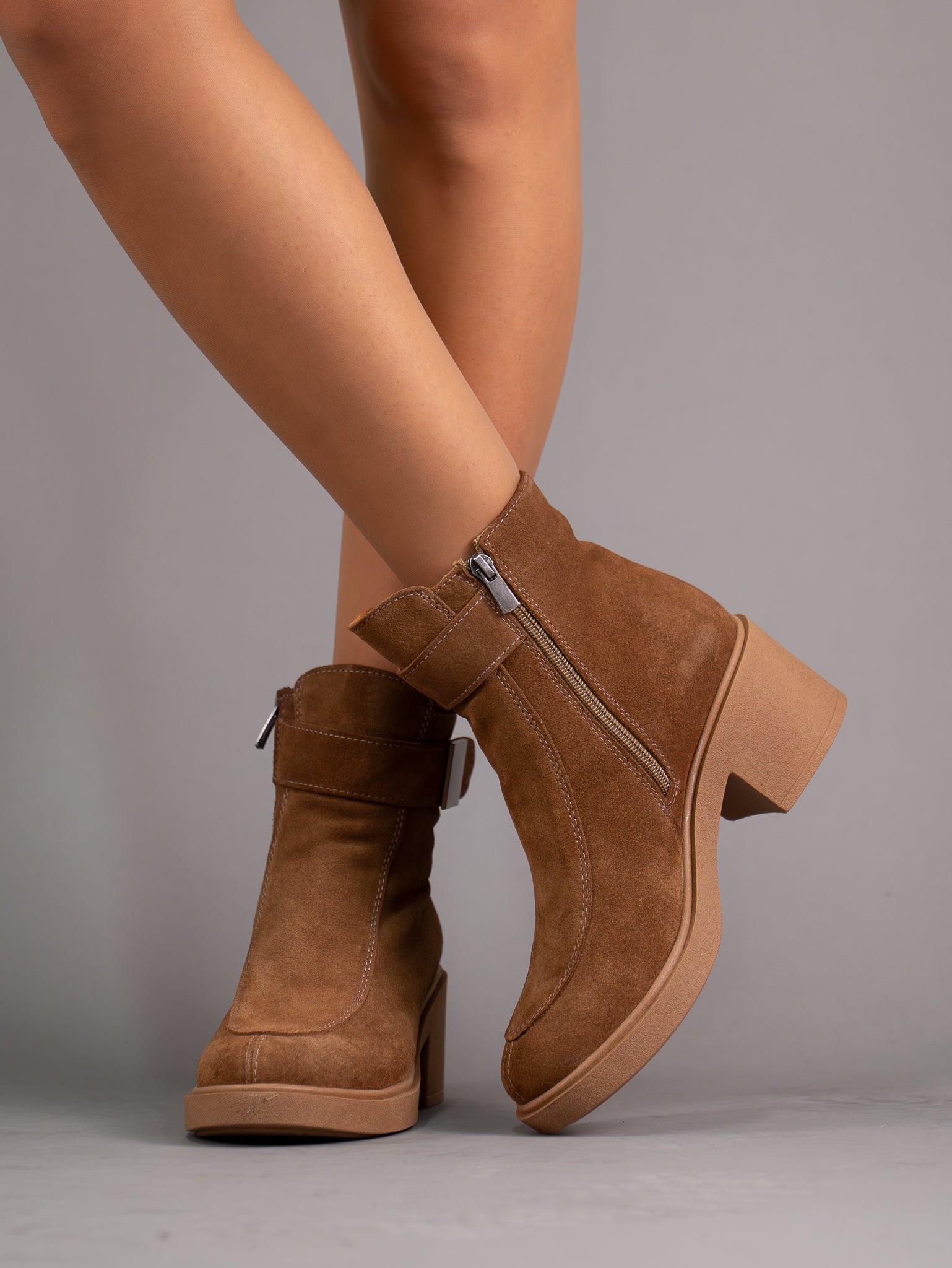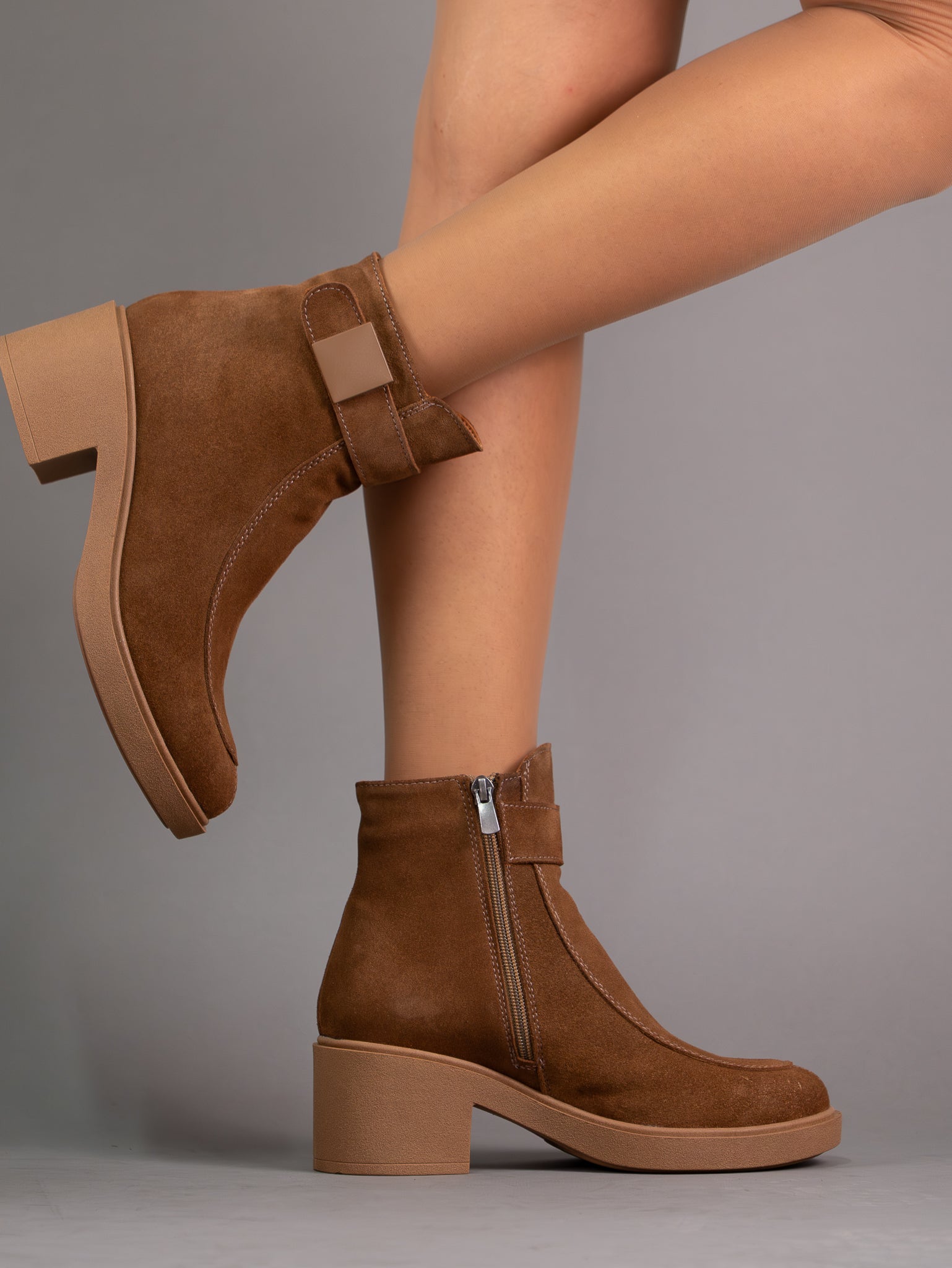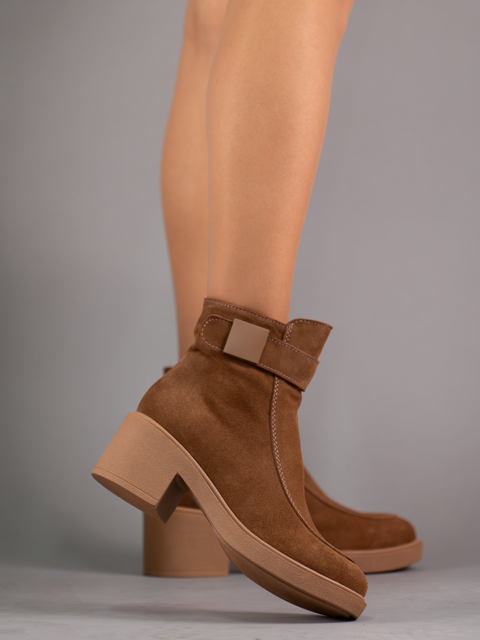 Ghete din piele naturala intoarsa cu bareta si accesoriu pe laterala. Modelul are talpa cu toc usoara si antiderapanta.