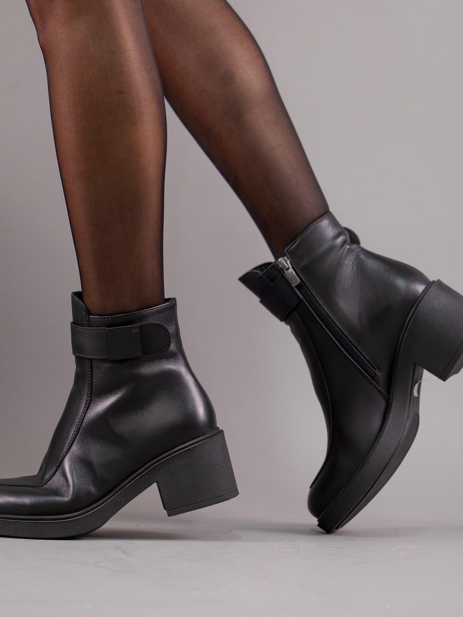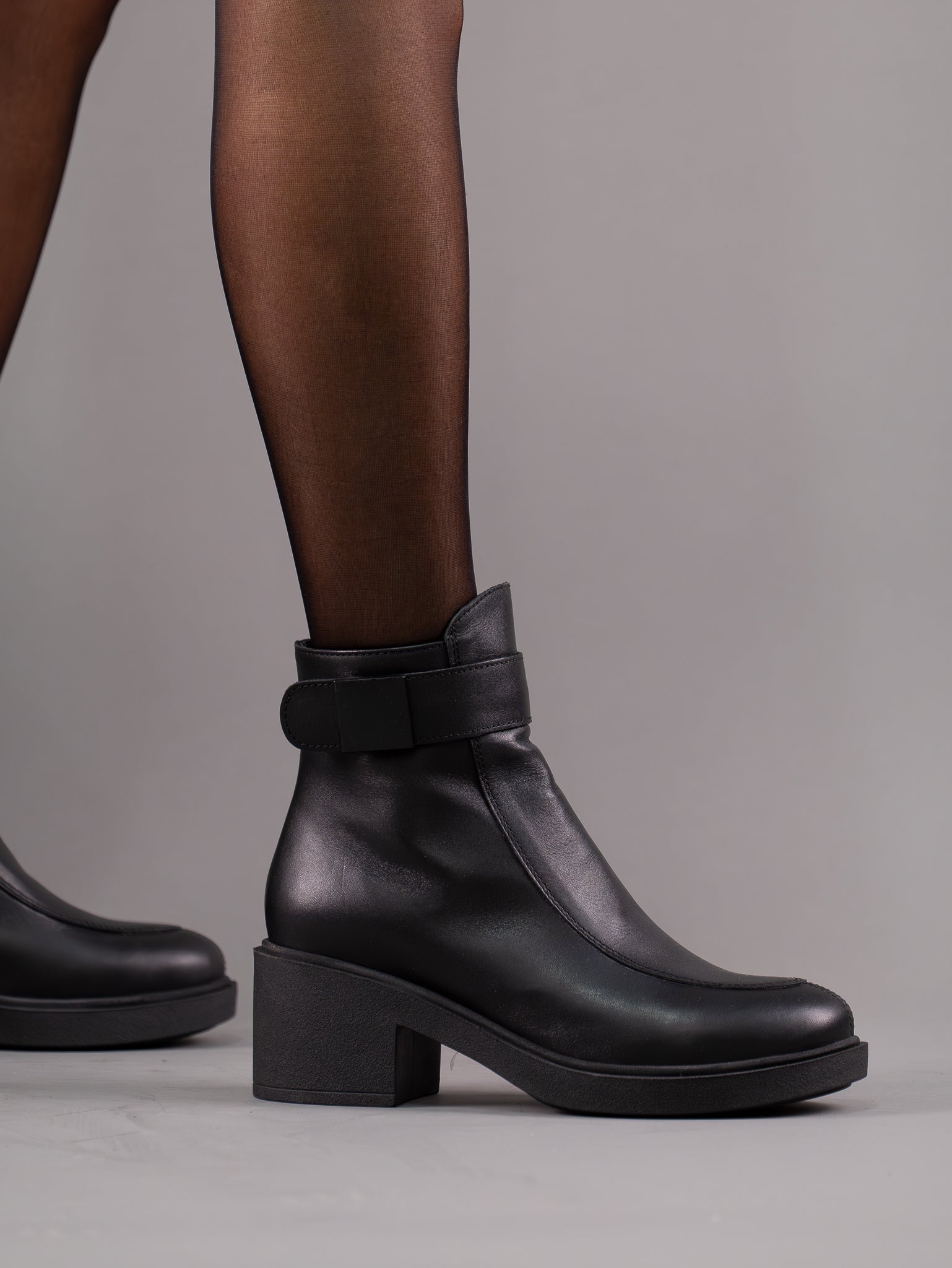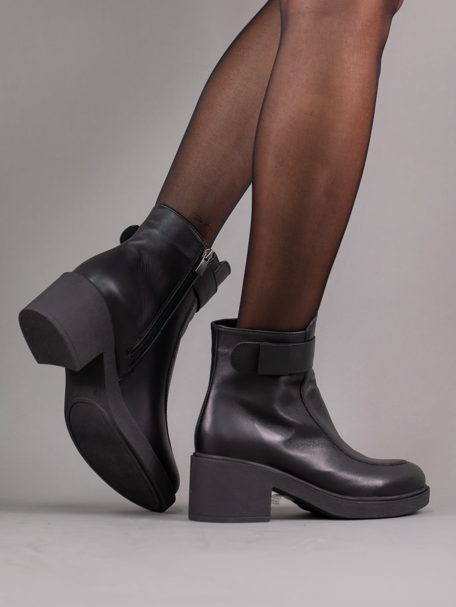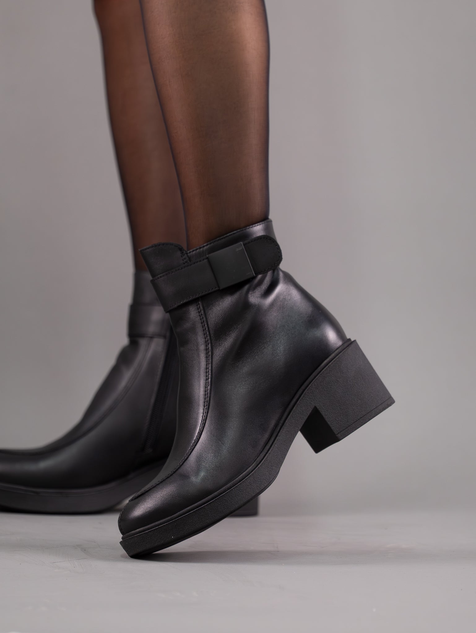 Ghete din piele naturala intoarsa cu bareta si accesoriu pe laterala. Modelul are talpa cu toc usoara si antiderapanta.