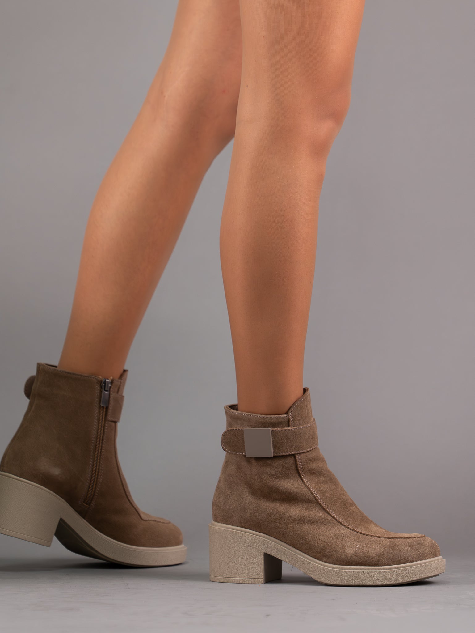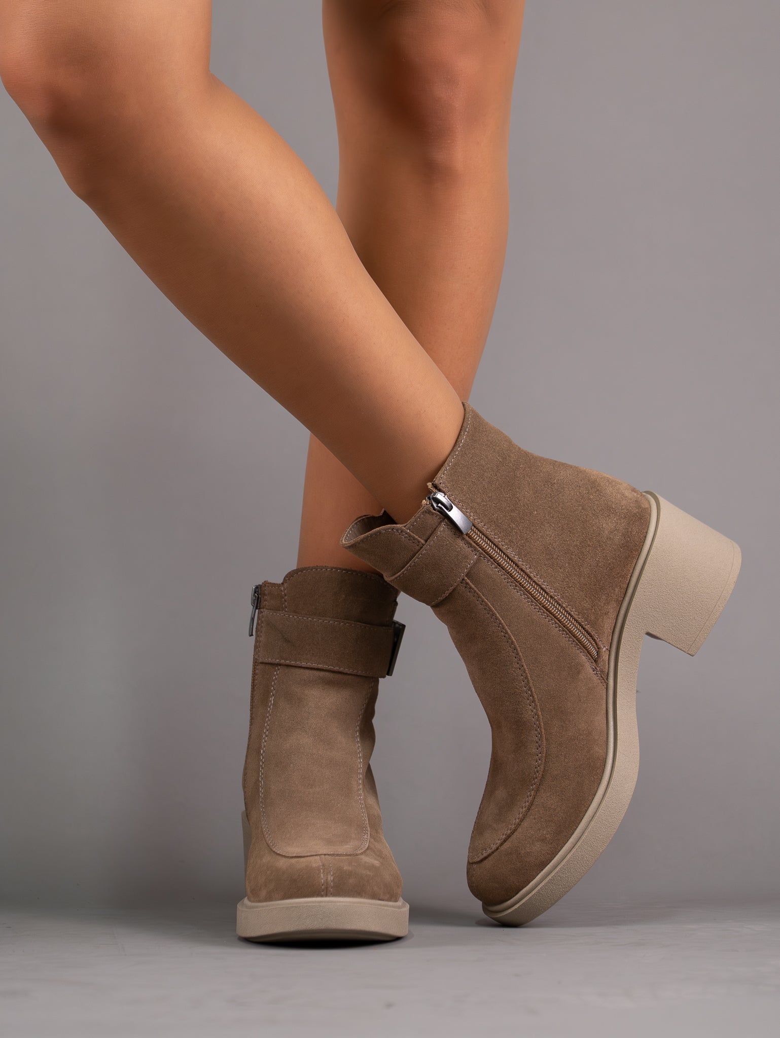 Ghete din piele naturala intoarsa cu bareta si accesoriu pe laterala. Modelul are talpa cu toc usoara si antiderapanta.