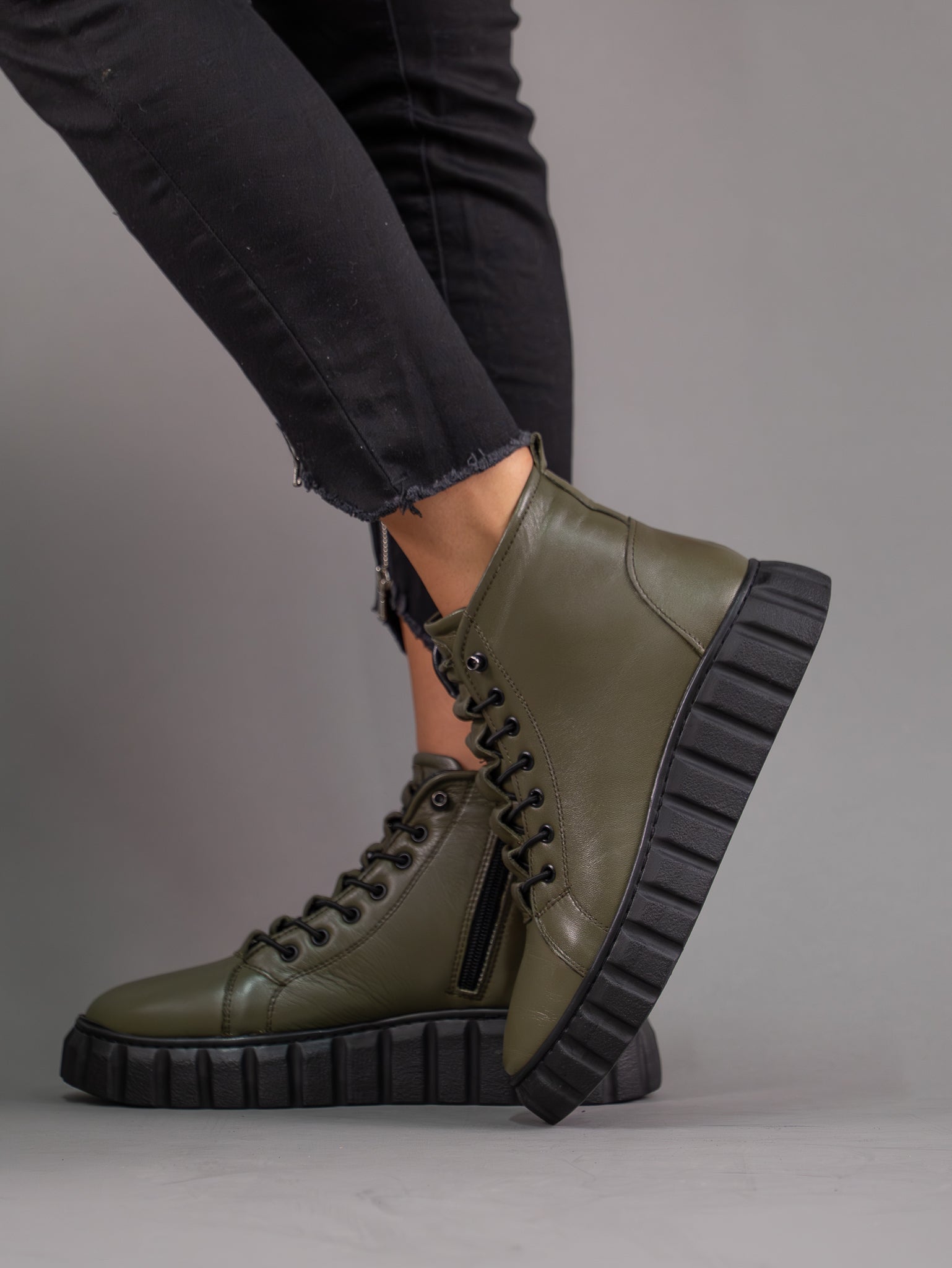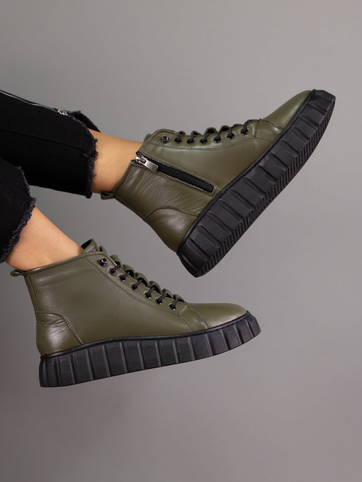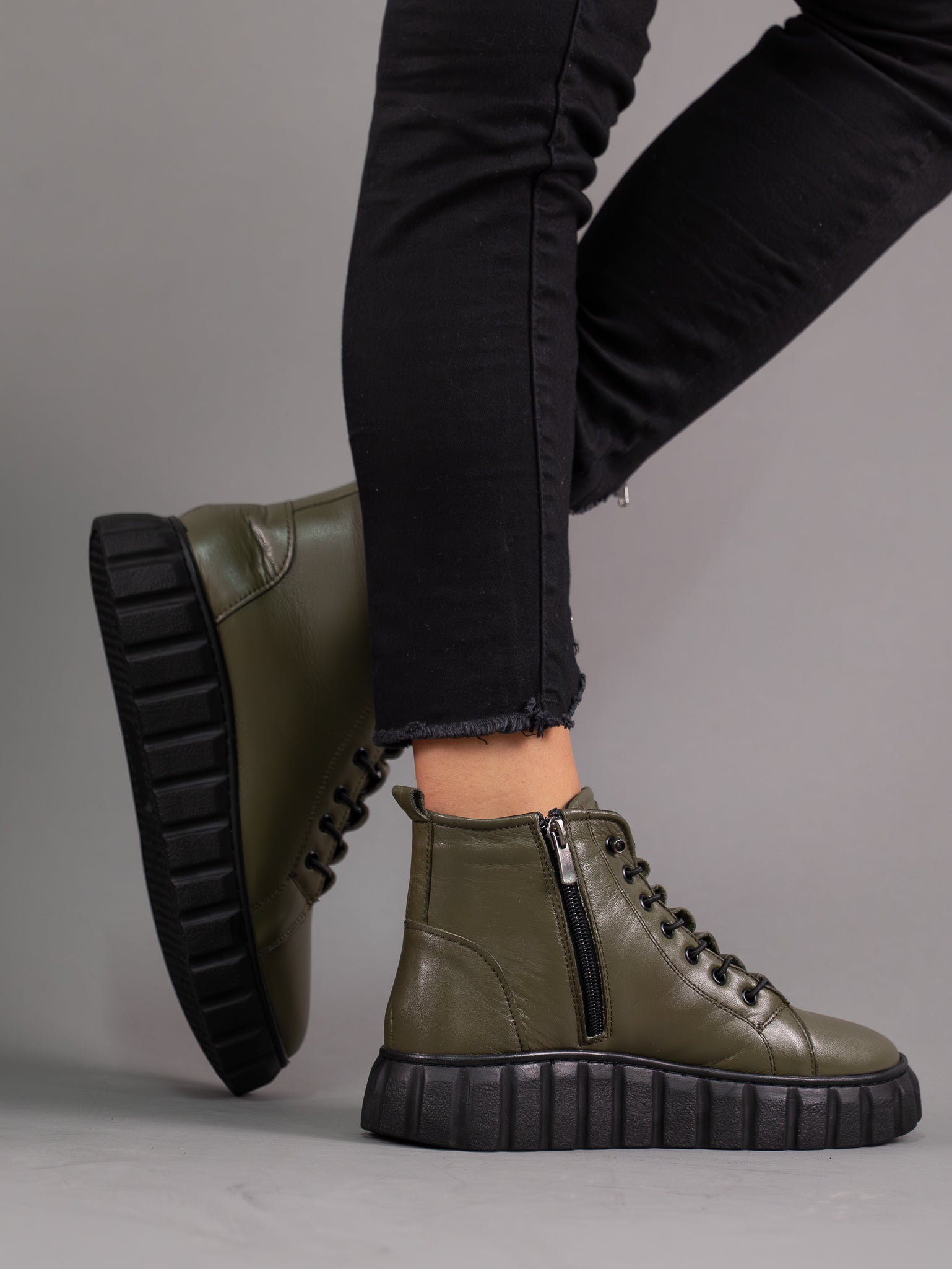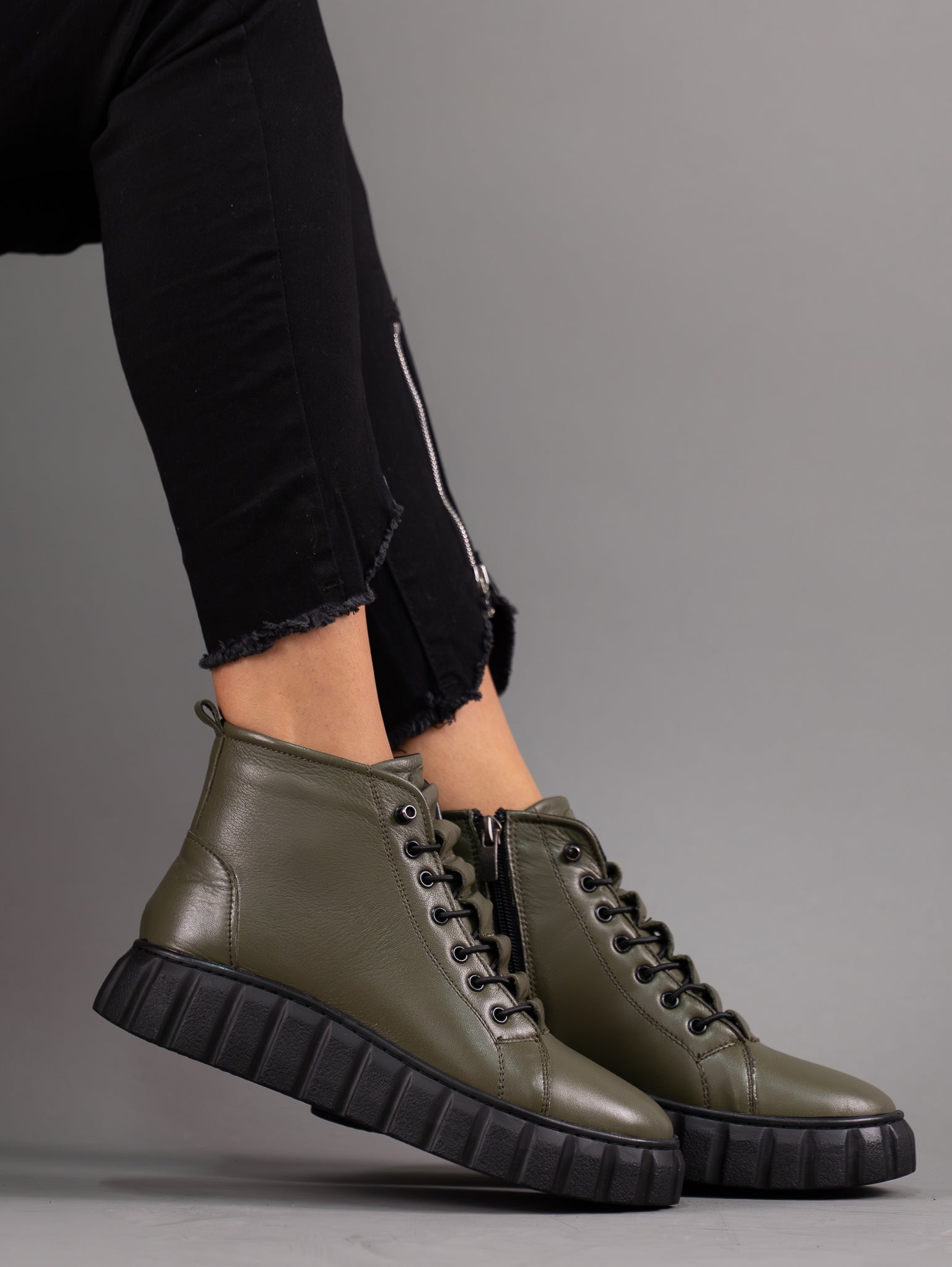 Ghete din piele naturala cu limba incretita in fata si siret elastic . Modelul are fermoar pe laterala. Captuseala si acoperisul de brant este din blana sintetica.
